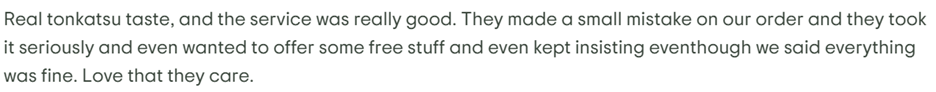 日本語訳:「本格的な豚骨の味が食べられて、サービスも本当に良かったです。スタッフが注文に細かいミスをしたが、私たちが平気だったのにずっと無料なものをあげたいと言ってました。そこまで気を配ってくれて最高です」