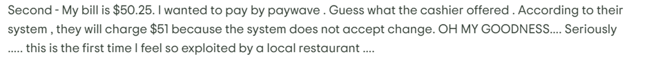 (日本語訳: 「…二つ目、会計は50.25ドルでクレジットカードで払いたかったが、レジ係が『お釣りを受け付けていないから51ドルにして』と言ったとは?まさか…シンガポールのローカルレストランに騙されたのは初めてです」