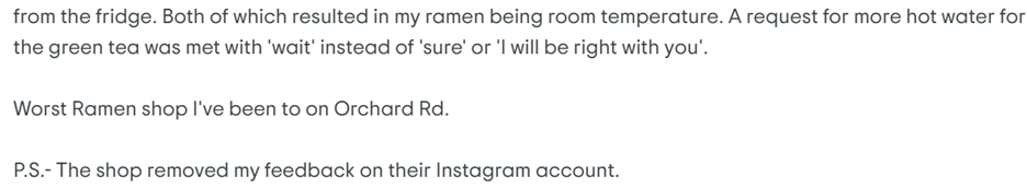 「…それでラーメンが冷めてしまいました。お湯を頼んだら『承知しました(sure)』や『少々お待ちくださいませ(I will be right with you)』ではなく『待って(wait)』と返されました。オーチャードロードで一番悪いラーメン店です。ちなみに公式インスタグラムにフィードバックを投稿したら削除されました」)