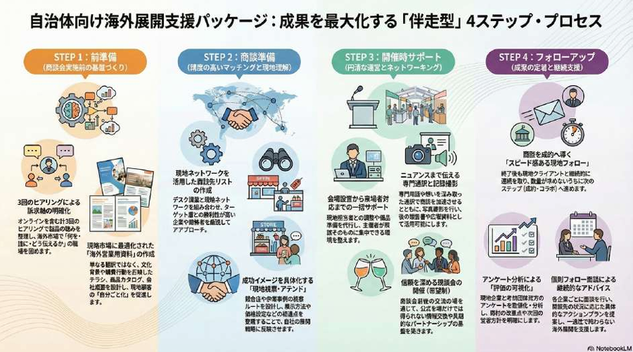 各企業‧団体様に対し、製品の強みや差別化ポイント、希望商談先などについて、計3回(オンライン含む)のヒアリングを実施します。海外展開でどのように製品やサービスを伝えるべきかを整理し、商談時の訴求軸を明確化。事前準備の精度を⾼めることで、限られた商談機会を最⼤限に活かせる状態を整えます。